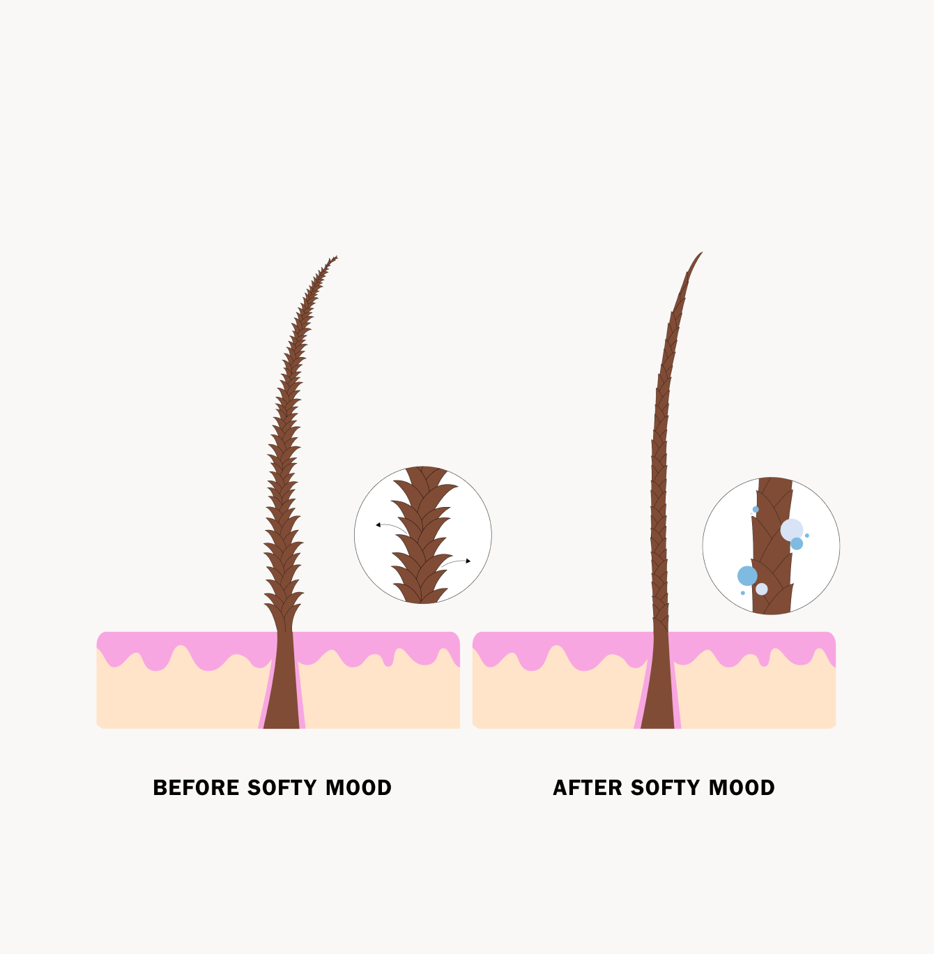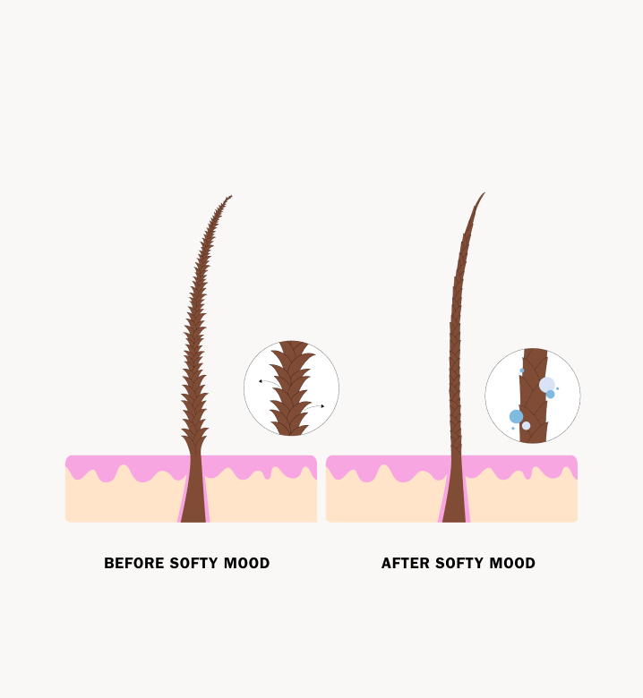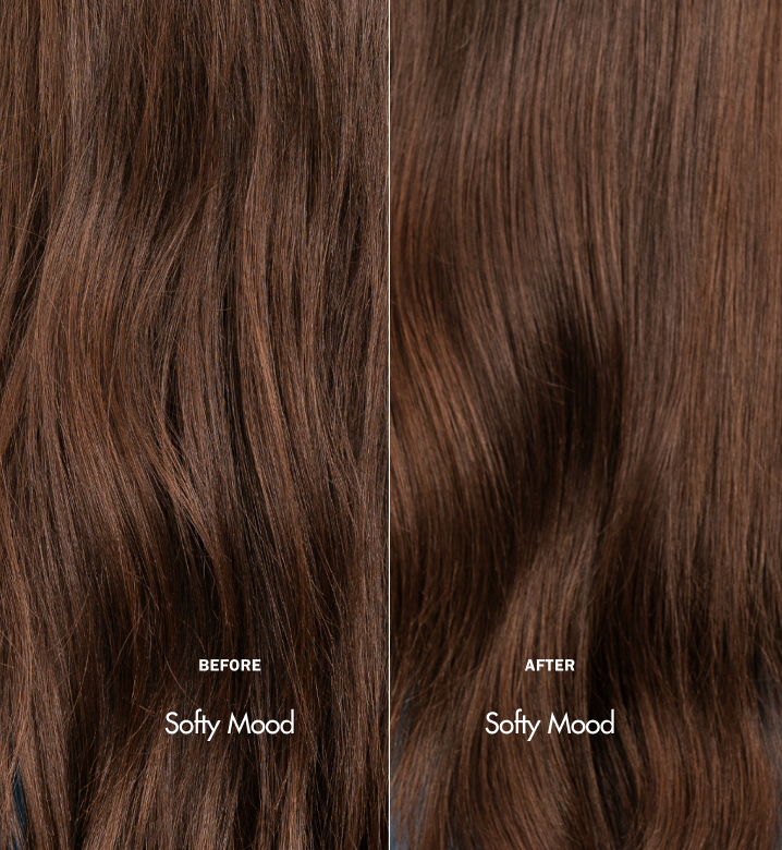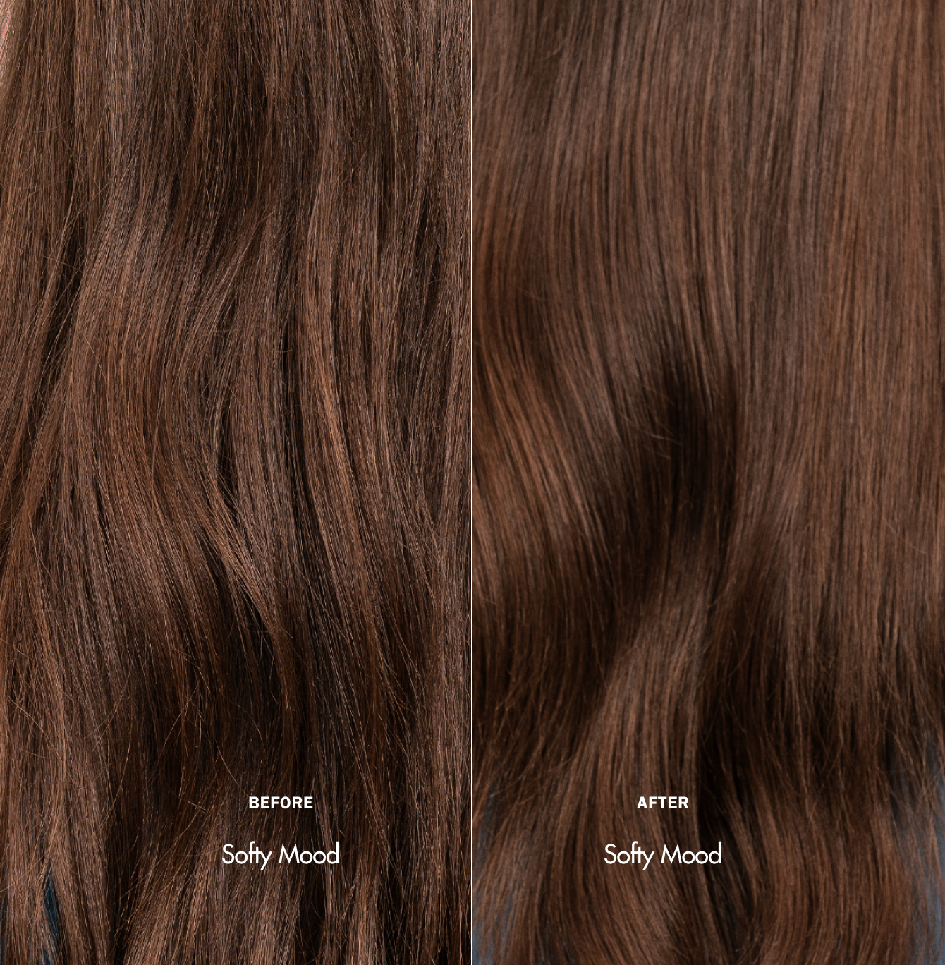 Softy Mood does not straighten or change the hair structure. It eliminates frizz while deeply moisturizing and increasing the strength and elasticity of the hair fiber. Thanks to a formula rich in oils and butters such as coconut and mango, it strengthens the hair fiber and provides incomparable softness and shine.